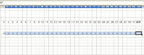 同じく行の科目ごとの合計も同様にセルAIに「=SUM(D5:AH5)」とコピー&ペーストします。